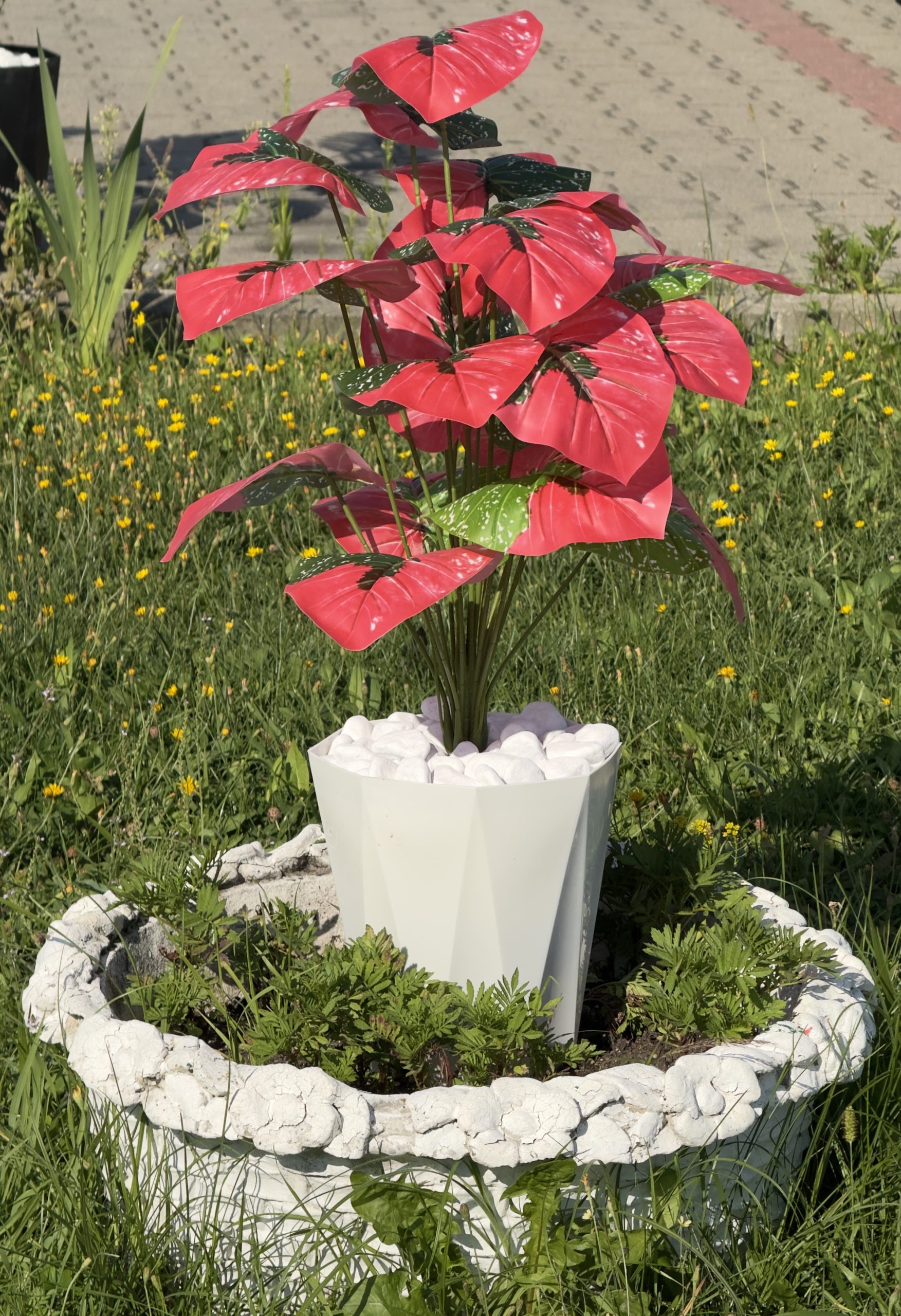 Combinație de plante artificiale cu frunze rosi si mari, aranjate într-un ghiveci modern cu pietriș decorativ, perfectă pentru a aduce culoare și prospețime în orice încăpere, fără întreținere.