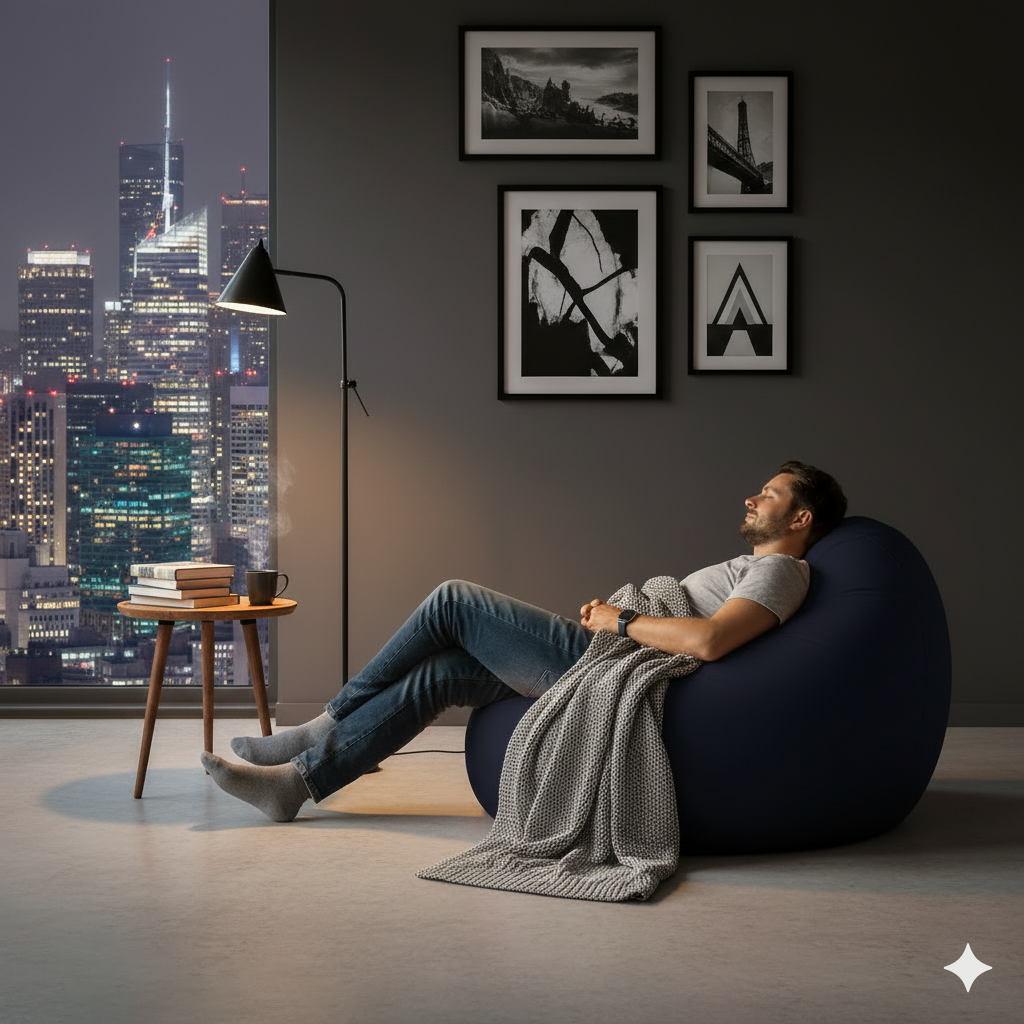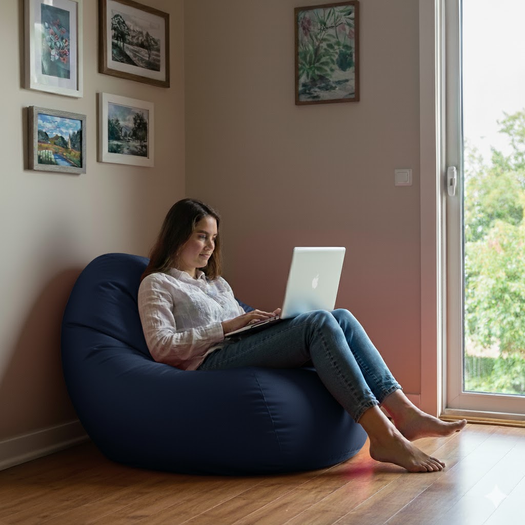 Fotoliu puf tip pară, umplut cu perle de polistiren. Dispune de o husă, cu mâner, din material impermeabil, astfel încât poate fi utilizat atât în interior cât și exterior.