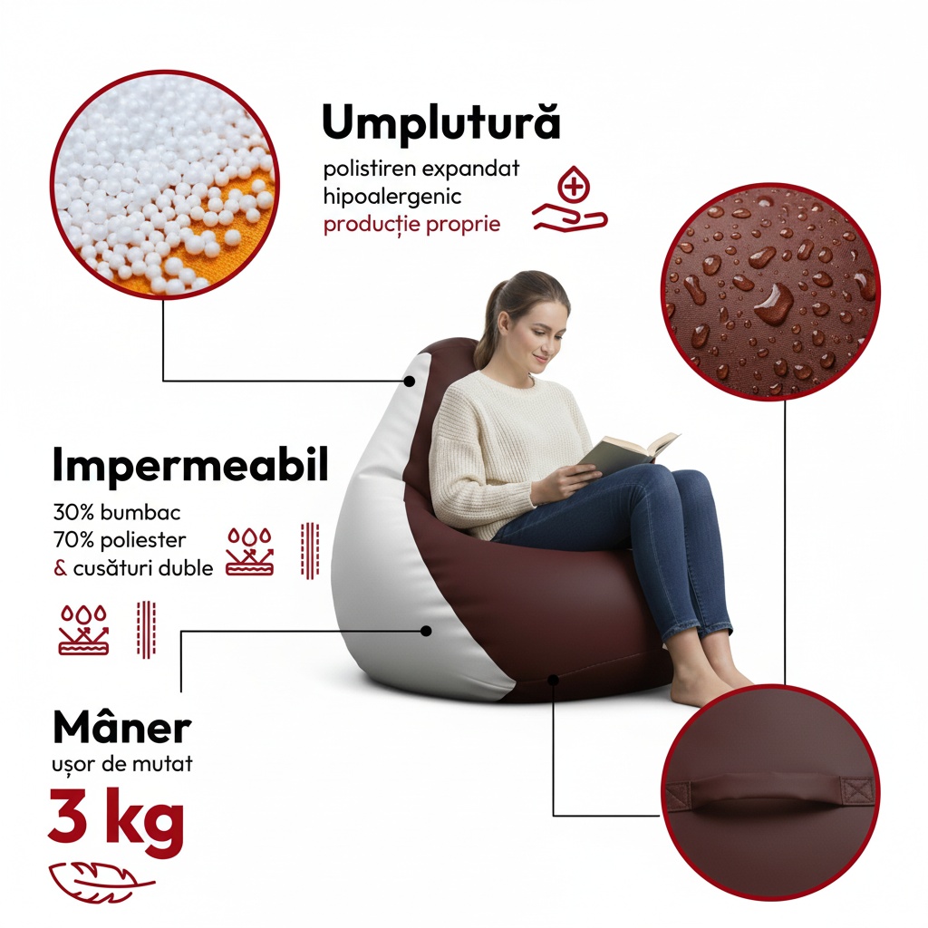 Fotoliu Puf tip pară – Maro/Alb, Bean Bag Relaxare completă și confort maxim cu acest fotoliu puf tip pară, umplut cu perle din polistiren care se mulează perfect pe corpul tău. Ideal pentru utilizare atât în interior, cât și în exterior, oferind un loc confortabil pentru citit, vizionat TV, jocuri sau relaxare. Tip: Puf tip…