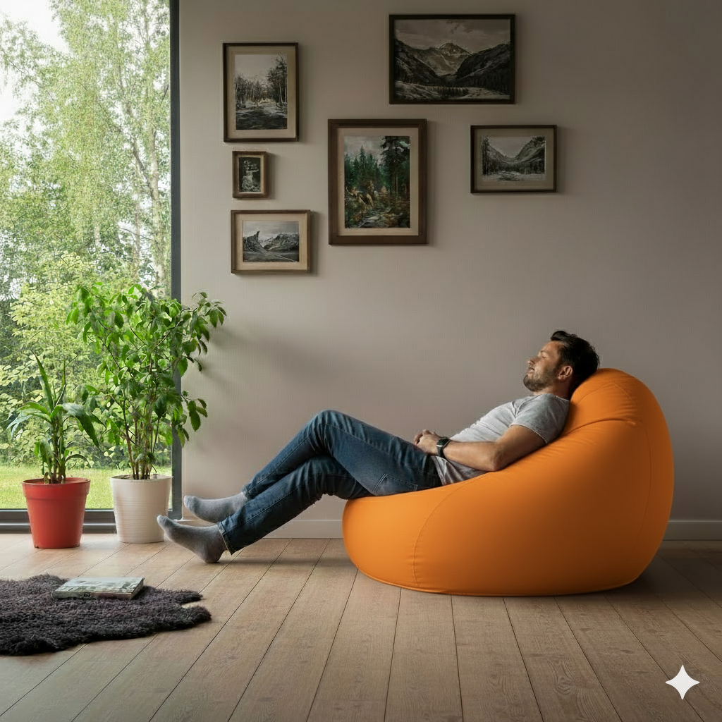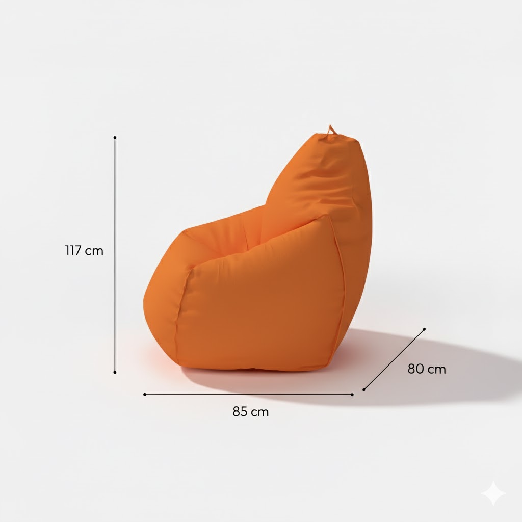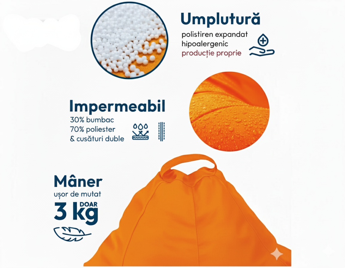 Fotoliu puf tip pară, umplut cu perle de polistiren. Dispune de o husă, cu mâner, din material impermeabil, astfel încât poate fi utilizat atât în interior cât și exterior.