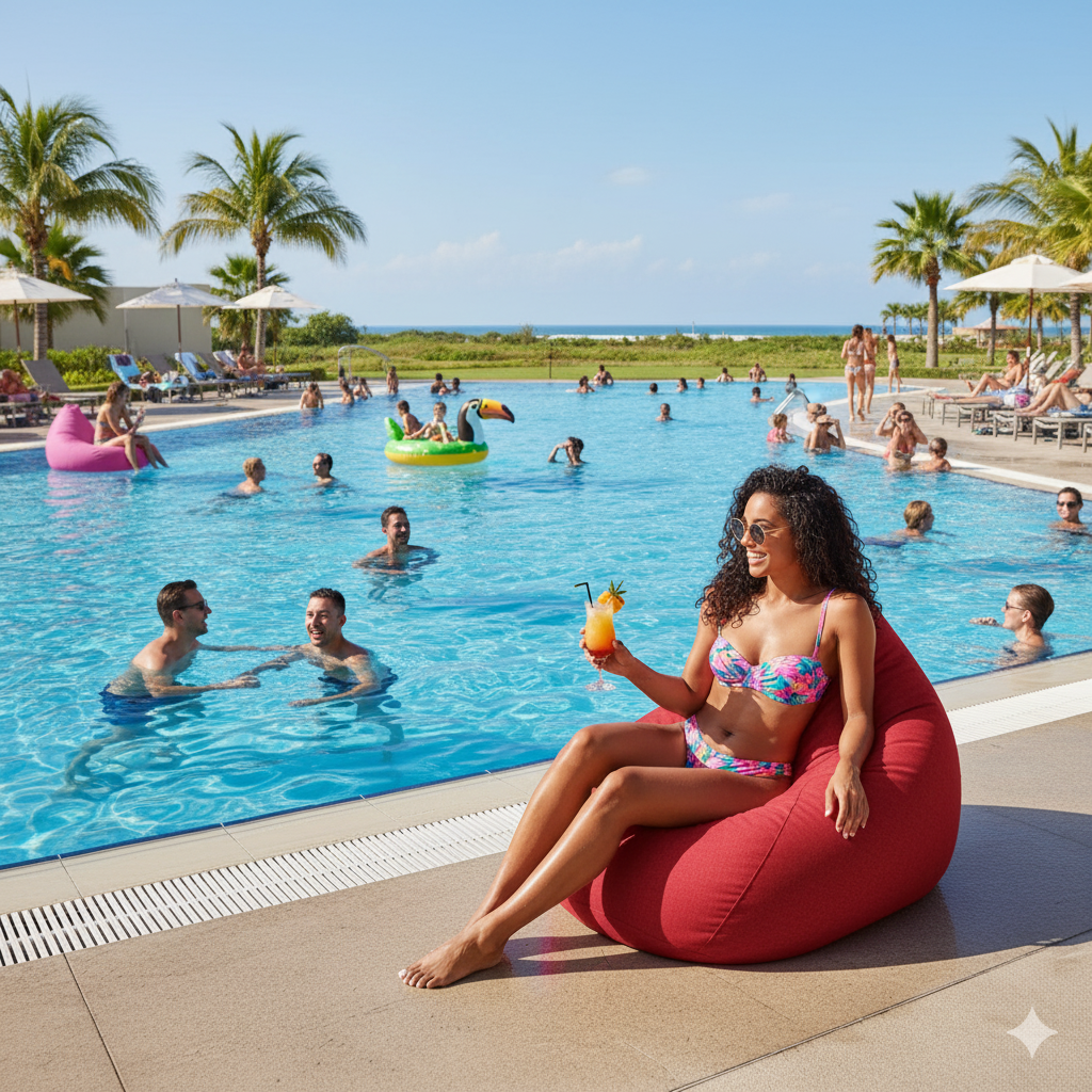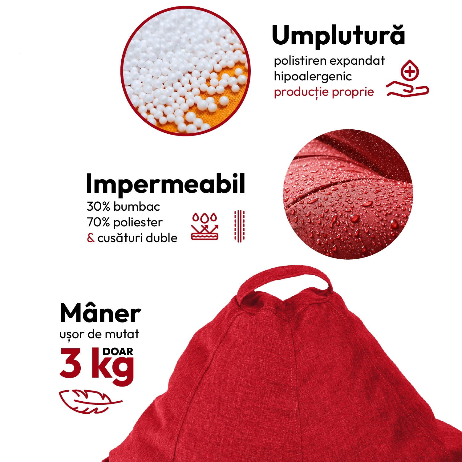 Fotoliu puf tip para, umplut cu perle de polistiren. Dispune de o husa, cu maner, din material impermeabil, astfel incat poate fi utilizat atat interior/exterior.