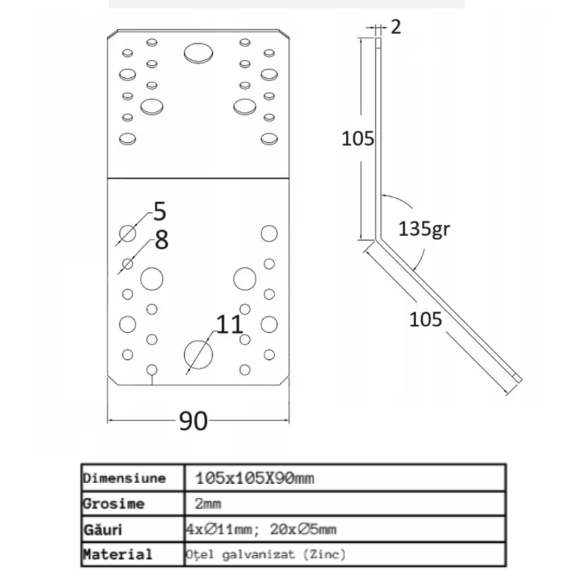 LEGฤTURฤ 135 DE GRADE 105MM COLศ PERFORAT PENTRU LEMN 105X105X90 MM Pachet de 10 console de colศ – 135 105+105×90 / Conector perforat / รmbinฤri pentru grinzi de lemn / Schelet pentru acoperiศuri / Metal galvanizat (zinc) Colศ perforat pentru lemn 105x105x90 mm CARACTERISTICI: Impermeabil, rezistent la coroziune, ignifug, acoperire durabilฤ