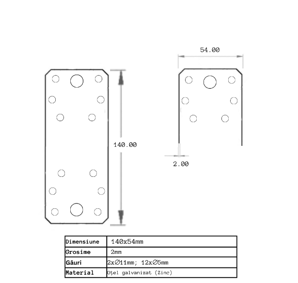 PLACA PERFORATA 140X54 PLACA, COLTAR PERFORAT PENTRU IMBINARE LEMN 140X54 MM Pachet 10 Suporturi plate 140×54 / Conector perforat / Imbinari pentru grinzi din lemn / Schelet pentru acoperis / Metal galvanizat (zinc) PLACA, Coltar perforat pentru imbinare lemn 140×54 mm CARACTERISTICI: Acoperire rezistentฤ la apฤ, rezistentฤ la coroziune, ignifugฤ, durabilฤ