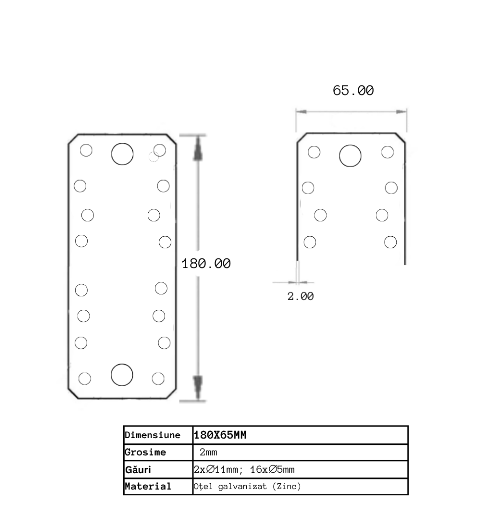 Pachet 10 Suporturi plate 180×65 / Conector perforat / Imbinari pentru grinzi din lemn / Schelet pentru acoperis / Metal galvanizat (zinc)