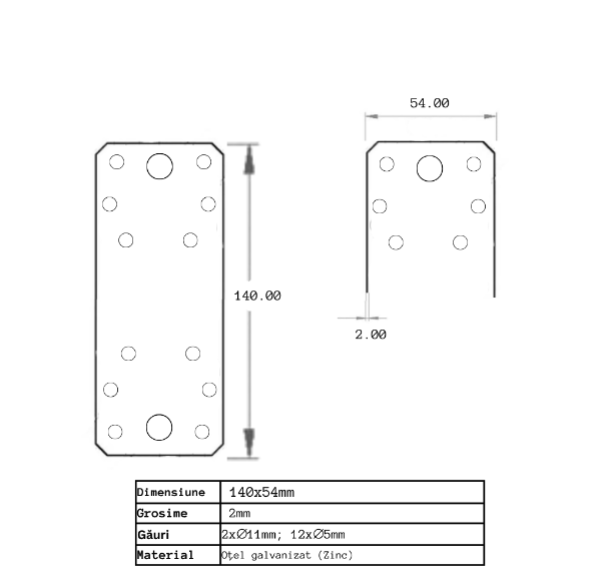 PLACA, Coltar perforat pentru imbinare lemn 140×54 mm
