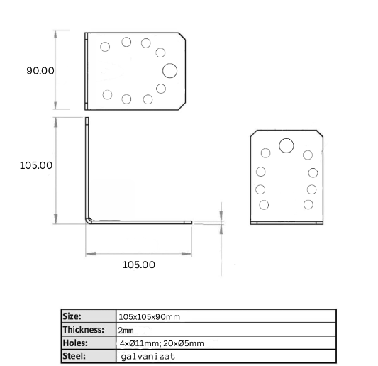 VINCLU SIMPLU 90 GRAD 105MM PWC-MON-2.1 COLTAR PERFORAT PENTRU LEMN 105X105X90 MM set 50 Suporturi de colt 105+105×90 / Conector perforat / Imbinari pentru grinzi din lemn / Schelet pentru acoperis / Metal galvanizat (Zinc) ATLANTIC 1979 Coltar perforat pentru lemn 105x105x90 mm CARACTERISTICI: Acoperire rezistentฤ la apฤ, rezistentฤ la coroziune, ignifugฤ, durabilฤ