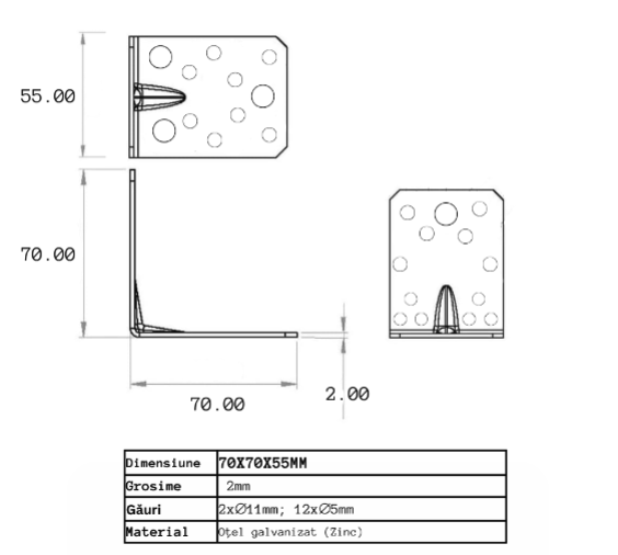 Acest vinclu de colศ la 90 de grade este realizat pentru a oferi stabilitate ศi durabilitate รฎn proiectele de construcศii ศi amenajฤri. Cu o dimensiune de 70mm pe fiecare laturฤ ศi o grosime de 2mm, este fabricat din tabla zincat (oศel acoperit cu zinc), oferind o protecศie sporitฤ รฎmpotriva coroziunii ศi asigurรขnd o duratฤ lungฤ de viaศฤ.