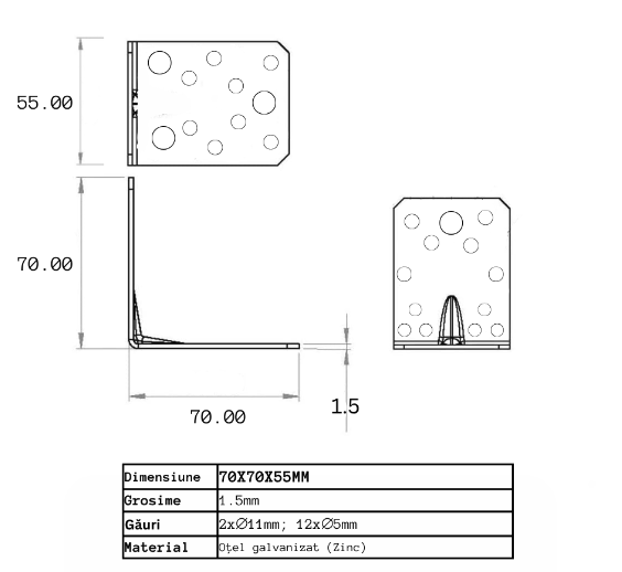 Acest vinclu de colศ la 90 de grade este realizat pentru a oferi stabilitate ศi durabilitate รฎn proiectele de construcศii ศi amenajฤri. Cu o dimensiune de 70mm pe fiecare laturฤ ศi o grosime de 2mm, este fabricat din tablฤ zincatฤ (oศel acoperit cu zinc), oferind o protecศie sporitฤ รฎmpotriva coroziunii ศi asigurรขnd o duratฤ lungฤ de viaศฤ.