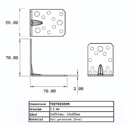 Acest vinclu de colț la 90 de grade este realizat pentru a oferi stabilitate și durabilitate în proiectele de construcții și amenajări. Cu o dimensiune de 70mm pe fiecare latură și o grosime de 2.5 mm, este fabricat din tabla zincat (oțel acoperit cu zinc), oferind o protecție sporită împotriva coroziunii și asigurând o durată lungă de viață.